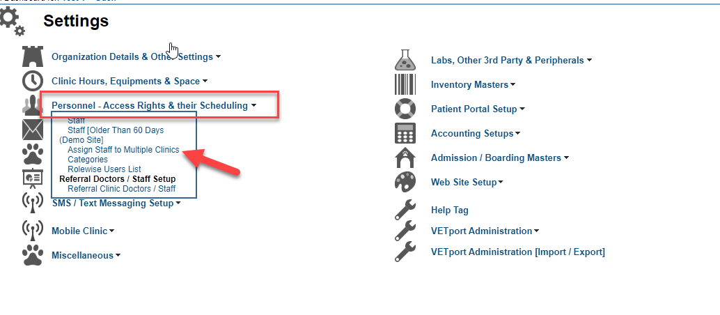 Add Doctors, Technicians, Receptionists, Assistants, Kennel Help etc. Create Logins and Manage Staff Details, Scheduling Requirement and more. Navigation Settings & Reports >> Settings >> Personnel - Access Rights & their Scheduling >> Staff Select ...